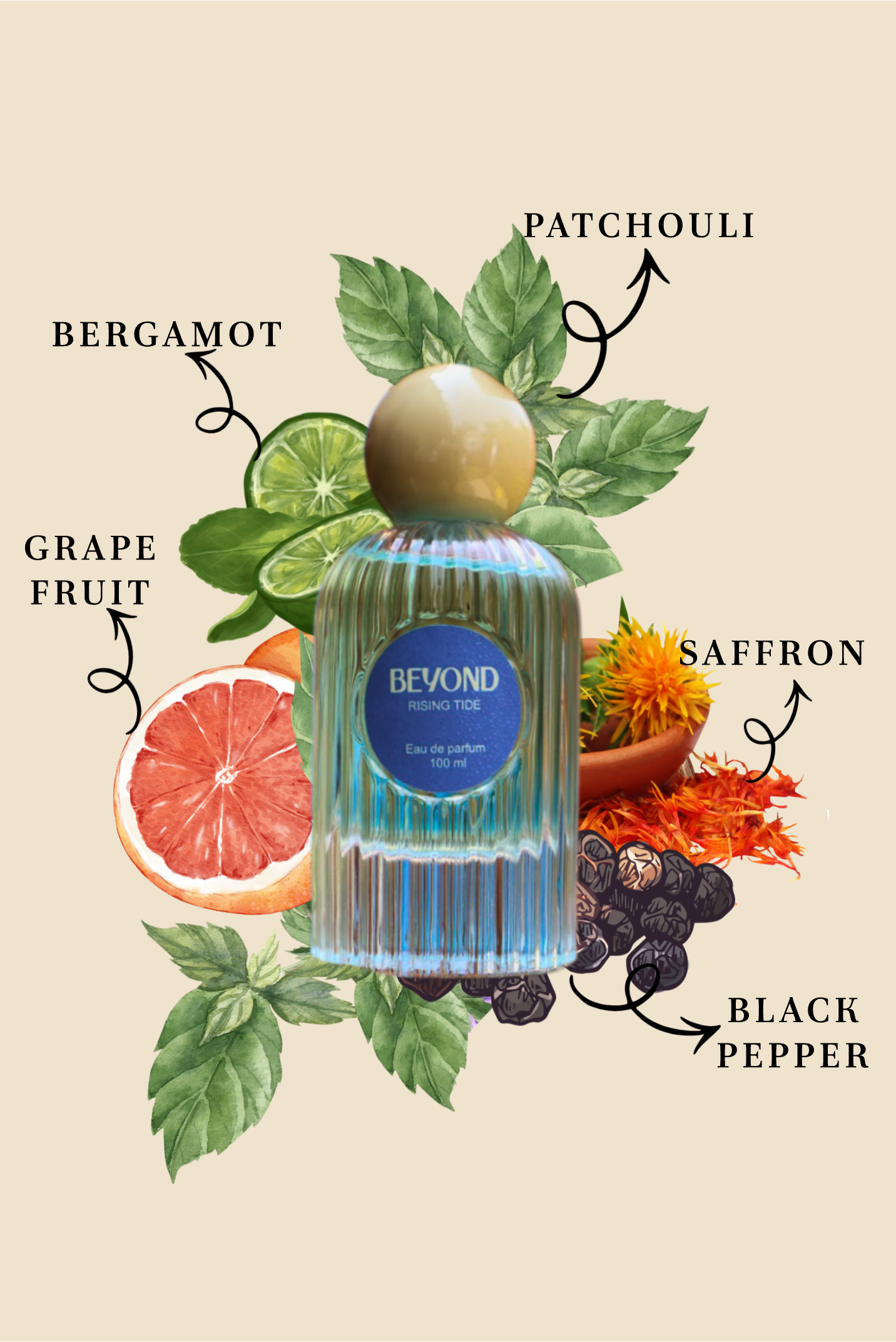 The goal with Rising Tide was always to create something that felt both effortless, yet unforgettably confident. A duality you can wear daily. So we worked to balance cool aquatic elements against warm saffron, bright citrus against earthier tonka and musk.